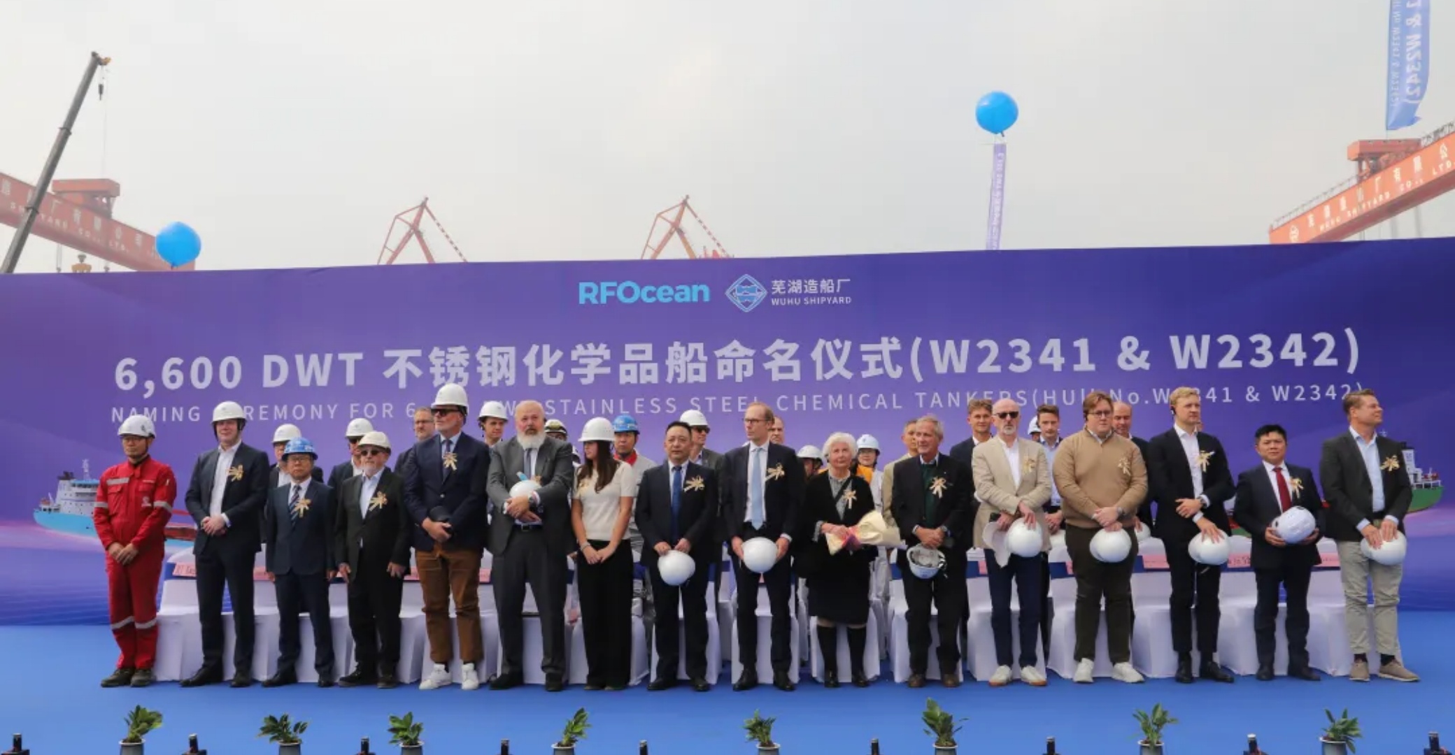 2025年10月27日上午,芜湖造船厂为挪威RFOcean公司监造的6600吨直流电推双相不锈钢化学品船一号船与二号船举行盛大命名仪式,船东RFOcean公司董事长Frederik Rye-Florentz及其合作伙伴共同见证这一里程碑时刻。