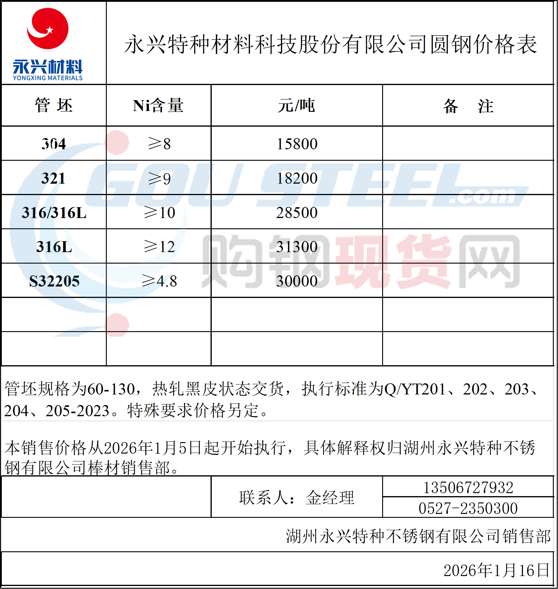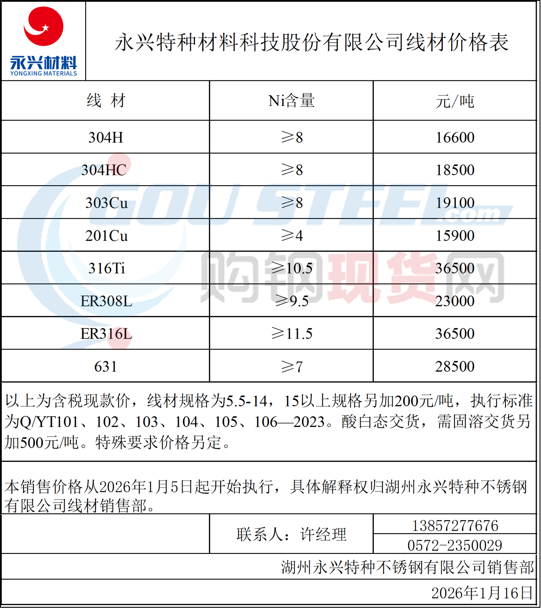 1月16日永兴特钢线材圆钢参考价