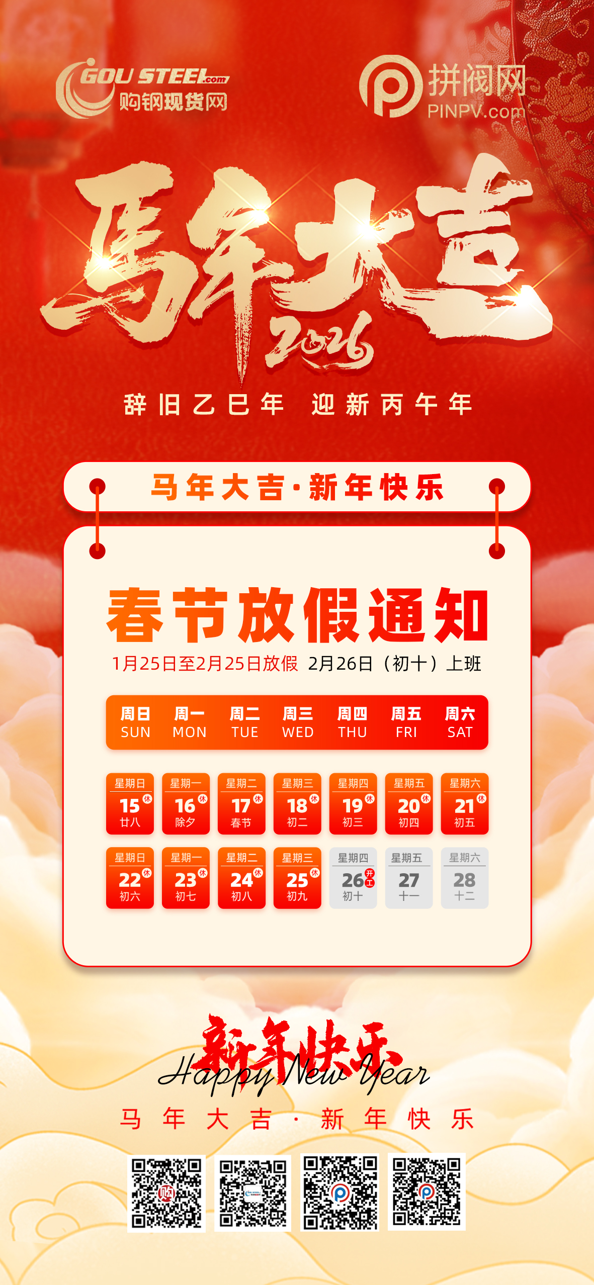 公司春节兹定于2026年01月25至2026年02月25日放假调休。于2026年02月26日正常上班,网站及微信公众号暂停更新,因此带来的不便请谅解。