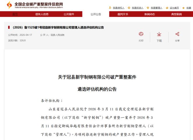 在钢铁行业“金三银四”传统旺季逐渐褪去的背景下,行业整合与出清仍在继续。据全国企业破产重整案件信息网最新公告显示,位于山东聊城冠县的冠县新宇制钢有限公司(以下简称“新宇制钢”)已正式进入破产程序,目前正在公开遴选评估机构。
