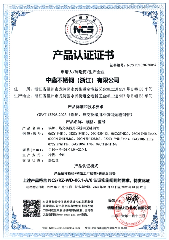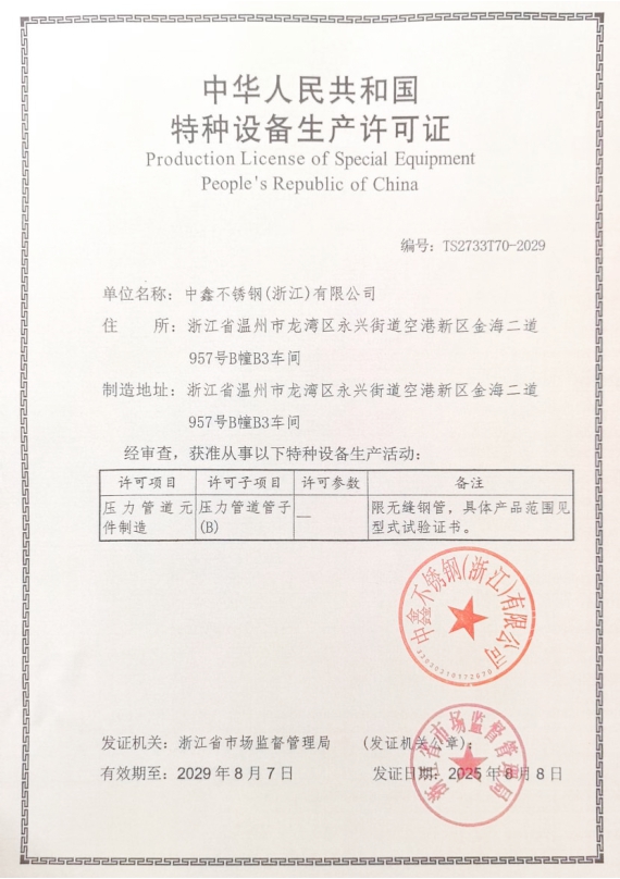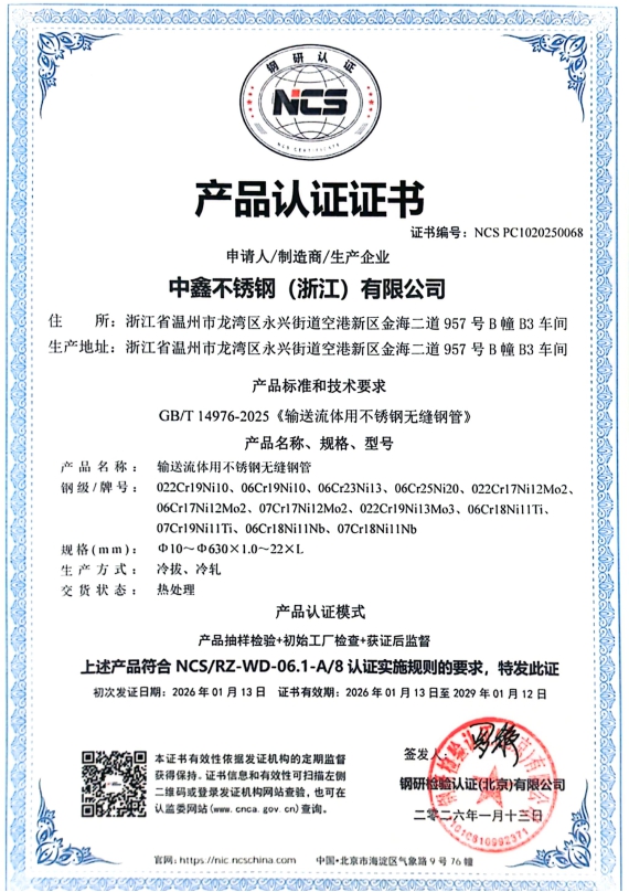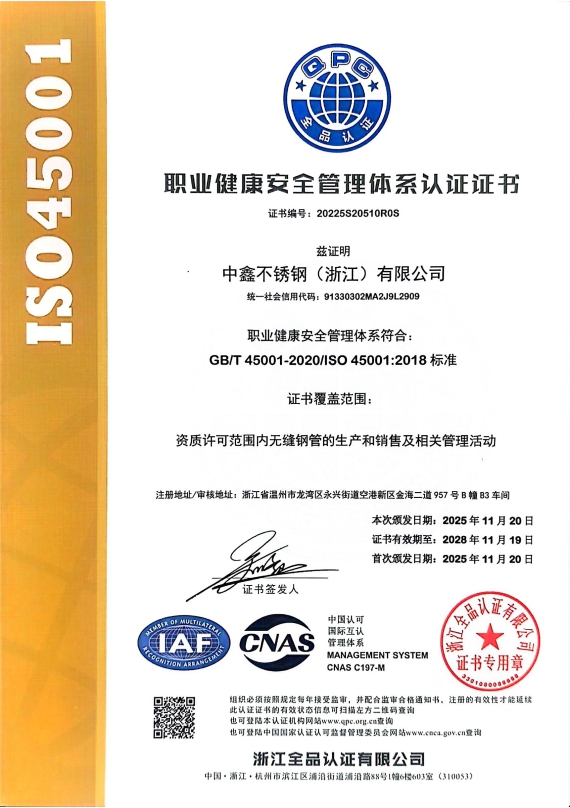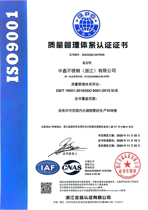 中鑫不锈钢(浙江)有限公司是一家聚焦中高端不锈钢管领域,集研发设计、生产制造、销售服务、自营进出口为一体的现代化制造企业,深耕管材制造领域多年,凭借过硬的产品品质与完善的产业布局,成为国内不锈钢管领域极具竞争力的标杆企业之一。