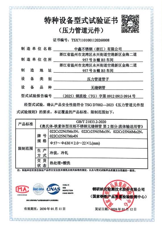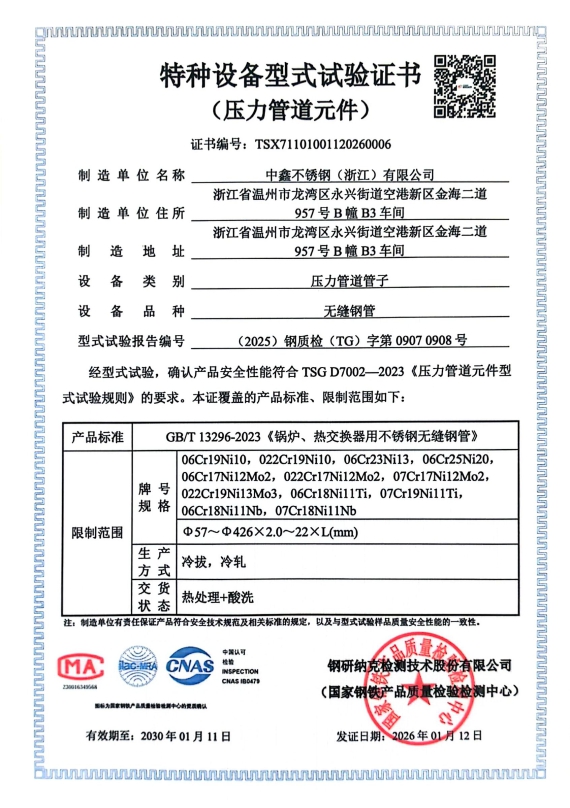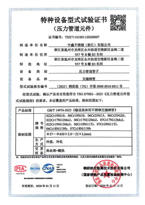 公司配备先进的不锈钢管制造生产线及全套检验检测设备,建有完善的理化检测中心、研发中心及CNAS认证实验室,无损检测设备齐全先进,可全方位保障产品质量与性能;公司总占地面积约70亩,生产厂房、仓储及科研办公楼总建筑面积达3万平方米,现有员工100余人,具备成熟的生产制造与技术研发团队。主营不锈钢无缝管产品,规格覆盖外径6-830mm、壁厚0.5-60mm,核心品类包含奥氏体、马氏体、双相钢、超级双相钢和镍基合金等特殊钢,年产能达20000吨不锈钢管。